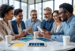 Two parents sitting at a table using smartphones and tablets, smiling and working together in a bright room.