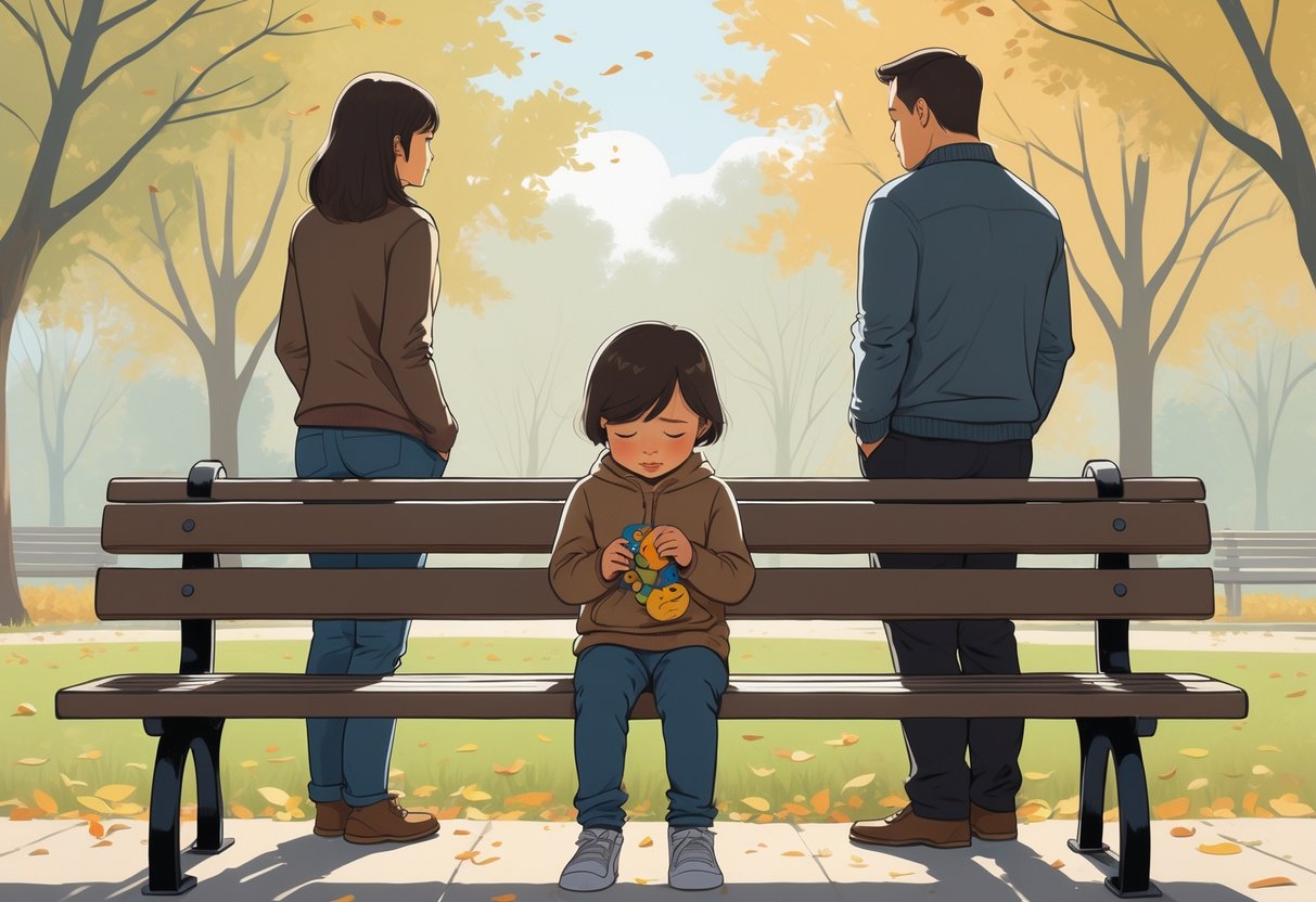 A child sitting alone on a park bench looking sad while two adults stand apart facing away from each other in the background.
